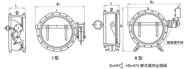 H47X、H47H、HH47X、HH47H、H47X、HDH47X 型蝶式緩沖止回閥主要用于工業供水、污水處理廠的水泵出口處,防止管網中介質逆流。自動消除破壞性水錘從而保證水泵和管路不受損壞。該閥主要由閥體、閥瓣、緩沖裝置和微量調節閥組成。該產品具有結構新穎、體積小、流體阻力小、運行平穩、密副可靠、耐磨損、緩沖性能好等特點是工業用水和城市排污的zui佳產品。